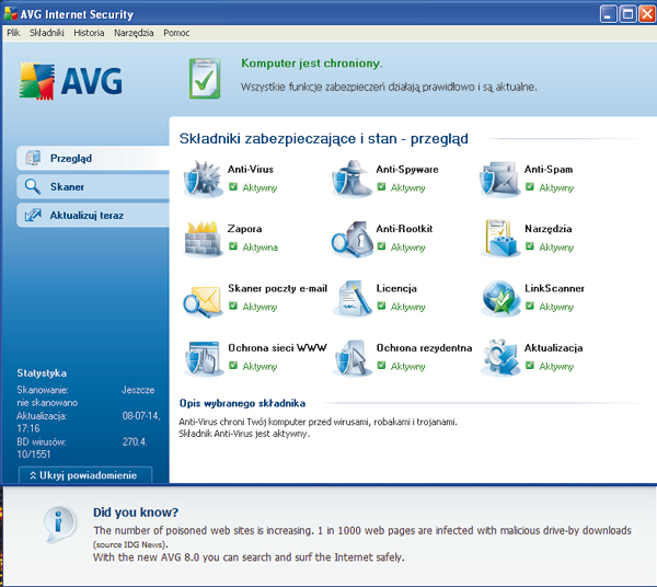 Interfejs programu jest teoretycznie polskojęzyczny. Jednak po kliknięciu w oknie głównym przycisku wyświetlającego jakieś powiadomienia ujrzeliśmy zapytanie „Did you know?”. Jeszcze gorzej jest z paskiem narzędziowym integrującym się z przeglądarką WWW, którego menu kontekstowe i nazwy opcji są… anglojęzyczne. Co gorsza, o ile ów pasek AVG integrował się z Internet Explorerem (wersja 7.), o tyle w trakcie uruchamiania Firefoksa 3 wyświetlał się błąd i… paska AVG nie było widać.