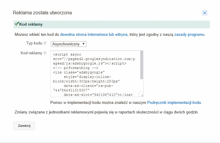 Na początek wygeneruj odpowiedni kod w panelu zarządzania usługą (np. Google AdSense, TradeDoubler, Tradetracker, Zanox) i skopiuj jego zawartość do schowka kombinacją klawiszy Ctrl+C. W naszym przykładzie wygenerowaliśmy kod dla reklamy o wymiarach 300×250 pikseli w Google AdSense: