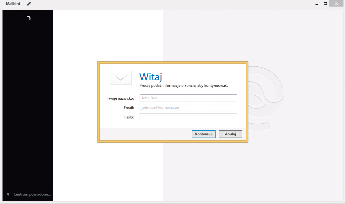 W pierwszym oknie kreatora program Mailbird prosi o podanie podstawowych informacji o konfigurowanym koncie pocztowym. Dzięki polskiemu tłumaczeniu konfiguracja jest niezmiernie łatwa. W polu Twoje nazwisko wpisz nazwę, która będzie wyświetlana w nagłówku wiadomości u odbiorcy, w polu Email umieść adres swojej skrzynki pocztowej, a poniżej hasło, jakie jest potrzebne, by się do niej zalogować. Kliknij przycisk Kontynuuj.