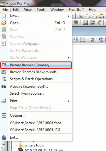 Photo Pos oprócz okna dialogowego do wczytywania nowego pliku ma narzędzie Picture Browser, które możesz uruchomić, klikając File, Picture Browser. Następnie, używając drzewa katalogów, przejdź do folderu ze zdjęciami. Z prawej strony zobaczysz zawartość tego katalogu. Jeśli zaznaczysz zdjęcie, jego szczegółowe parametry pojawią się z lewej strony. Aby wczytać plik, kliknij go myszą i zamknij okno Browse Directory.