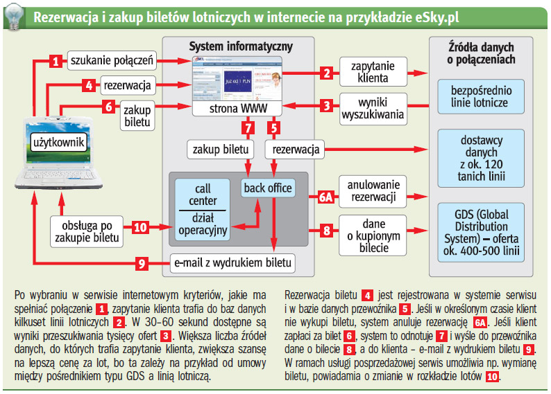 Jednym z polskich serwisów dystrybucji biletów lotniczych online jest eSky.pl. Przez internet sprzedaje ok. 12 tys. biletów miesięcznie. Od października 2008 korzysta z autorskiego systemu wyszukiwania połączeń, który ułatwia też rezerwację biletu i umożliwia płacenie zań przelewem. System, nad którym programiści pracowali blisko rok, ma spowodować wzrost liczby klientów, przychodów i zysków. Te ostatnie w 2008 roku wyniosły ok. 1,9 mln zł; w 2009 roku mają to być ponad 4 mln zł.