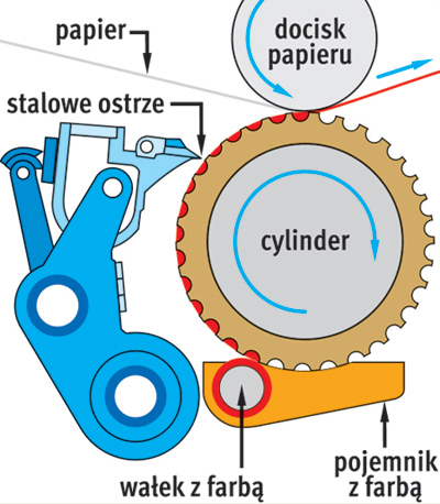 Matryca drukarska ma kształt cylindra, w którym są wygrawerowane zagłębienia – tzw. kałamarzyki. Grawerowanie odbywa się w nałożonej na stalowy cylinder warstwie miedzi, która na koniec jest utwardzana warstwą chromu. Osiem cylindrów – po cztery dla każdej strony papieru – montuje się w maszynie drukarskiej. Każdy z czterech kolorów CMYK jest drukowany przez dwa cylindry. Wirujący cylinder najpierw styka się z pokrytym farbą wałkiem. W wyniku zetknięcia farba wpływa do kałamarzyków. Stalowe ostrze walca przesuwającego się po powierzchni usuwa nadmiar farby. Dalszy obrót cylindra styka jego powierzchnię z papierem. W wyniku ruchu obrotowego farba z kałamarzyków jest wyrzucana na powierzchnię papieru. Dodatkowo, aby papier lepiej przyjmował farbę, stosuje się przyciąganie elektrostatyczne.