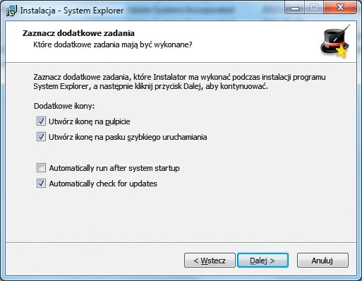 Podczas instalacji System Explorera pojawia się pytanie, czy uruchamiać automatycznie aplikację razem z systemem Windows. Wówczas program będzie dostępny z zasobnika systemowego, co zalecane jest tylko wtedy, gdy masz zamiar korzystać z niego na co dzień. Jeśli nie chcesz skorzystać z tej opcji, odznacz opcję Automatically run after system startup (będzie można to później zmienić w opcjach).