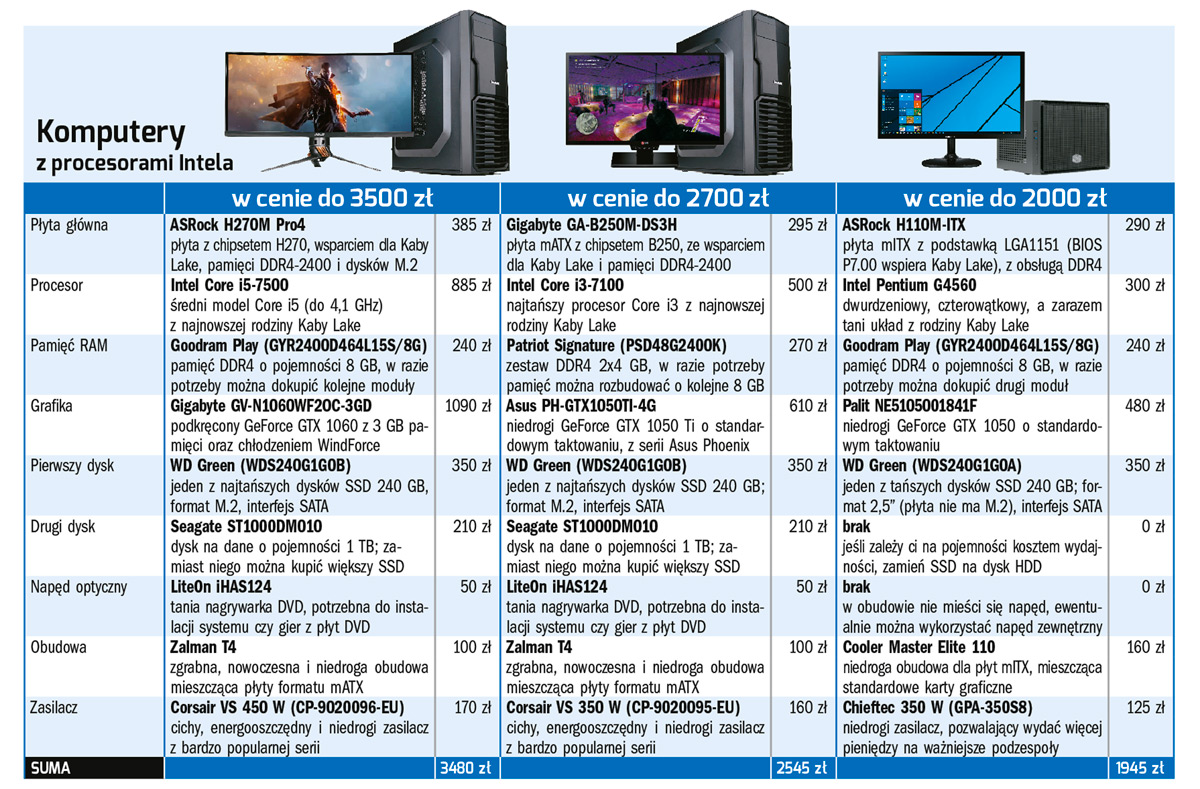 Nieznaczny spadek cen produktów spowodował, że również w tej konfiguracji udało się wykorzystać procesor Ryzen 5 (najtańszy model 1400), a także najtańszą płytę z chipsetem AMD A320. Wprawdzie jeszcze taniej wypada sprzęt złożony na platformie AM3+ (np. z procesorem FX-8370), ale jest to mało przyszłościowe rozwiązanie. Również w tej konfiguracji znalazły się dwa dyski SSD+HDD, natomiast podstawową różnicę w stosunku do sprzętu za 3500 zł stanowi grafika GeForce GTX 1050 Ti. Jest też pojedynczy moduł pamięci 8 GB (w późniejszym czasie można dokupić drugi), poza tym brakuje napędu optycznego (również łatwo go dołożyć).